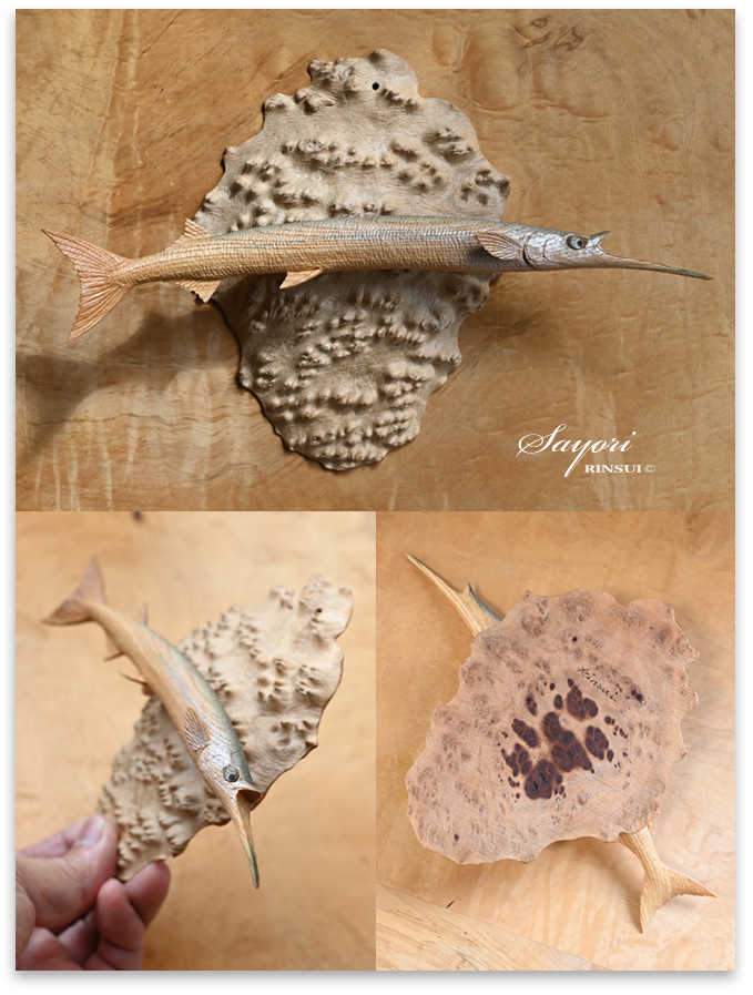 山女魚はサイズ約37cm、台座のシャムガキとクスに取り付けていますが