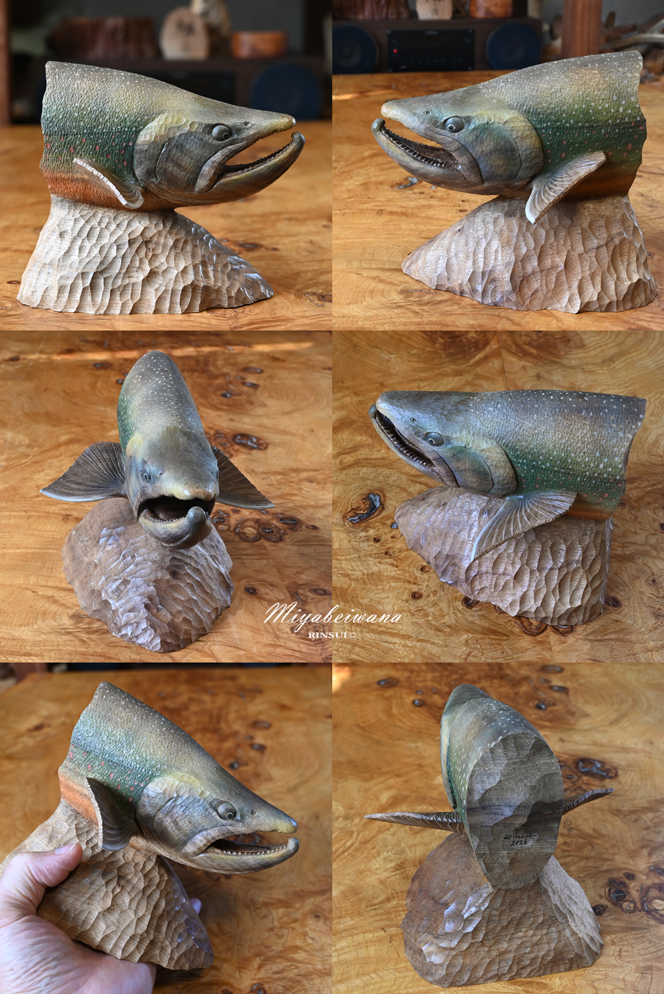 神代クスで彫り上げたサイズ約17cmのミヤベイワナヘッドになります。 全身サイズにすれば約38cmくらいのサイズ感になるかとおもいます。 青黒い神代クスとミヤベイワナのグリーンバックそれに婚姻色の色合いの相性がよく 飽きの来ない渋い作品に仕上がっています。 ミヤベイワナ好きな方に是非オブジェとしてお勧めです。 魚サイズ 約17cm 材:神代クス 150,000円 (税込み) Back